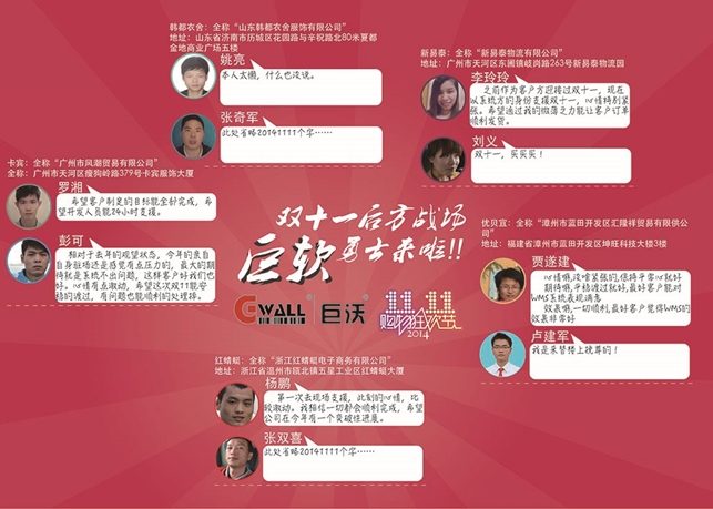 他们立下豪言壮语,写下心愿祝福,一一表达了自己对双十一的期望。他们低调中带着诚恳的语言,他们空白中隐含千言万语的字里行间,字字句句述说了对双十一的雄心壮志!